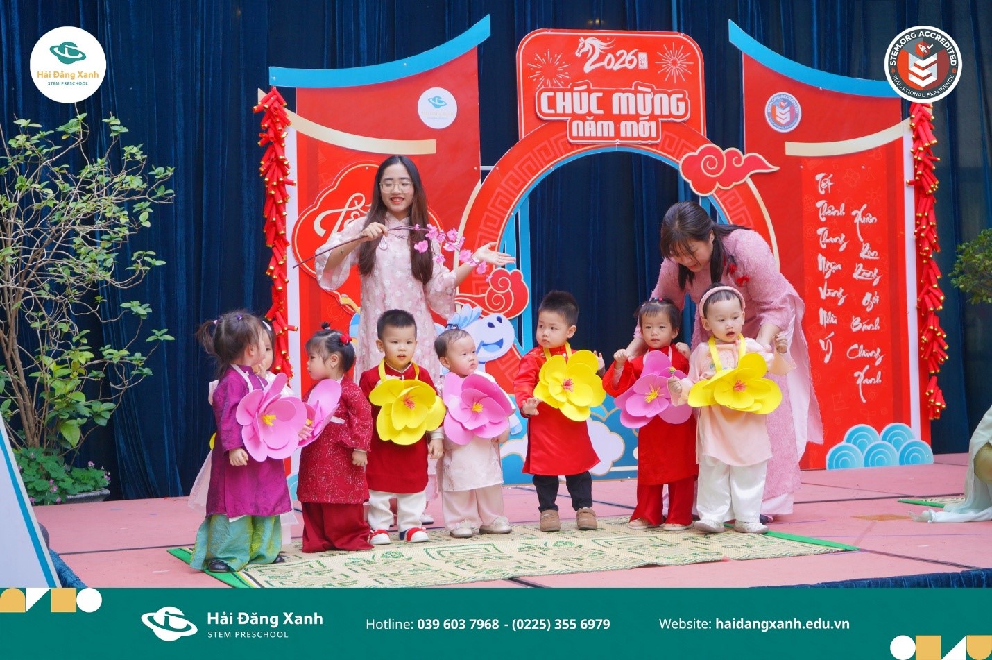 Amid the joyful spirit of the year-end season, the Hai Dang Xanh campus was beautifully decorated with peach blossoms, apricot flowers, calligraphy scrolls, and traditional symbols of Vietnamese New Year. The event was designed to help children experience Vietnamese Tet culture in a vivid and engaging way.