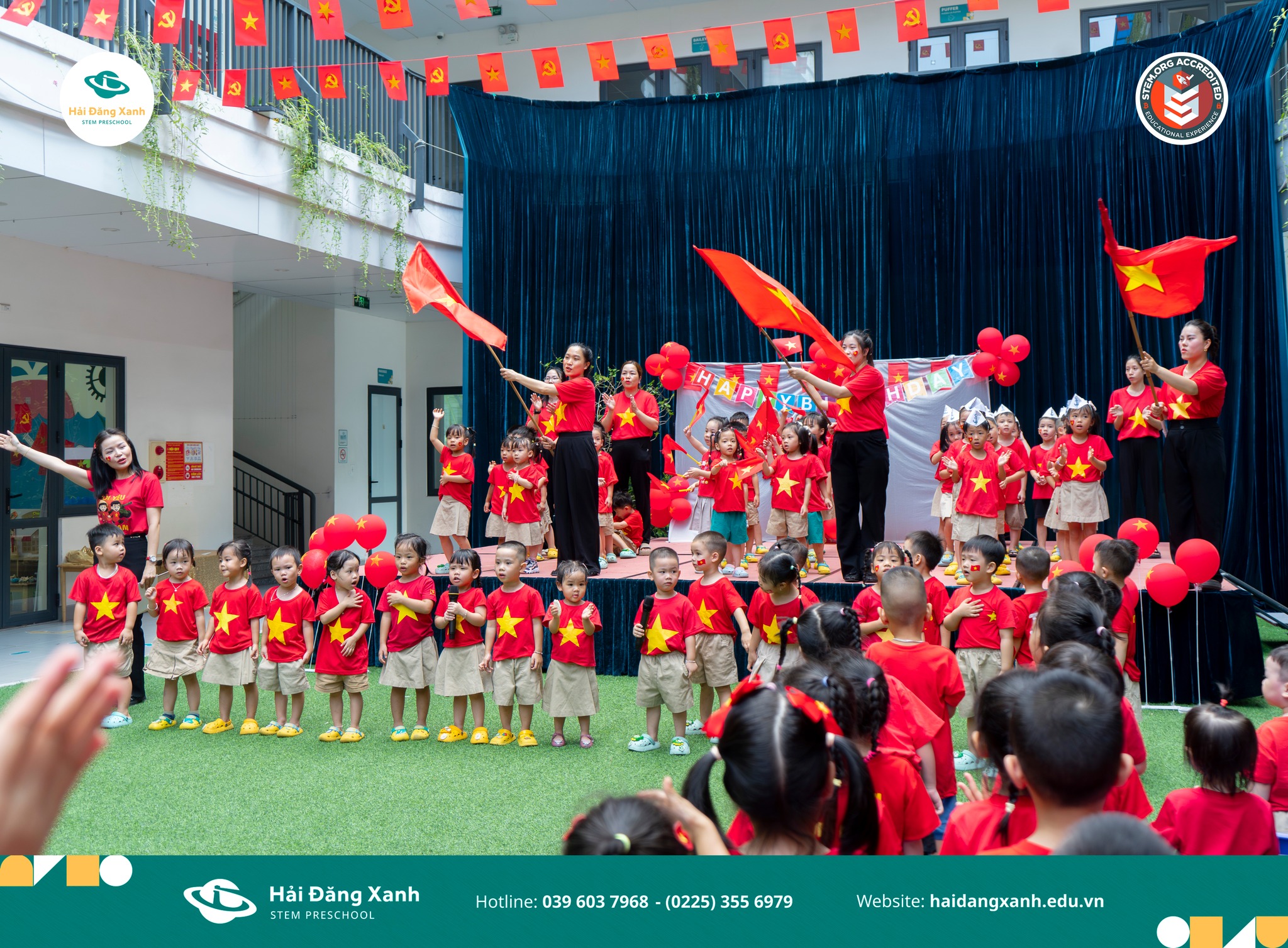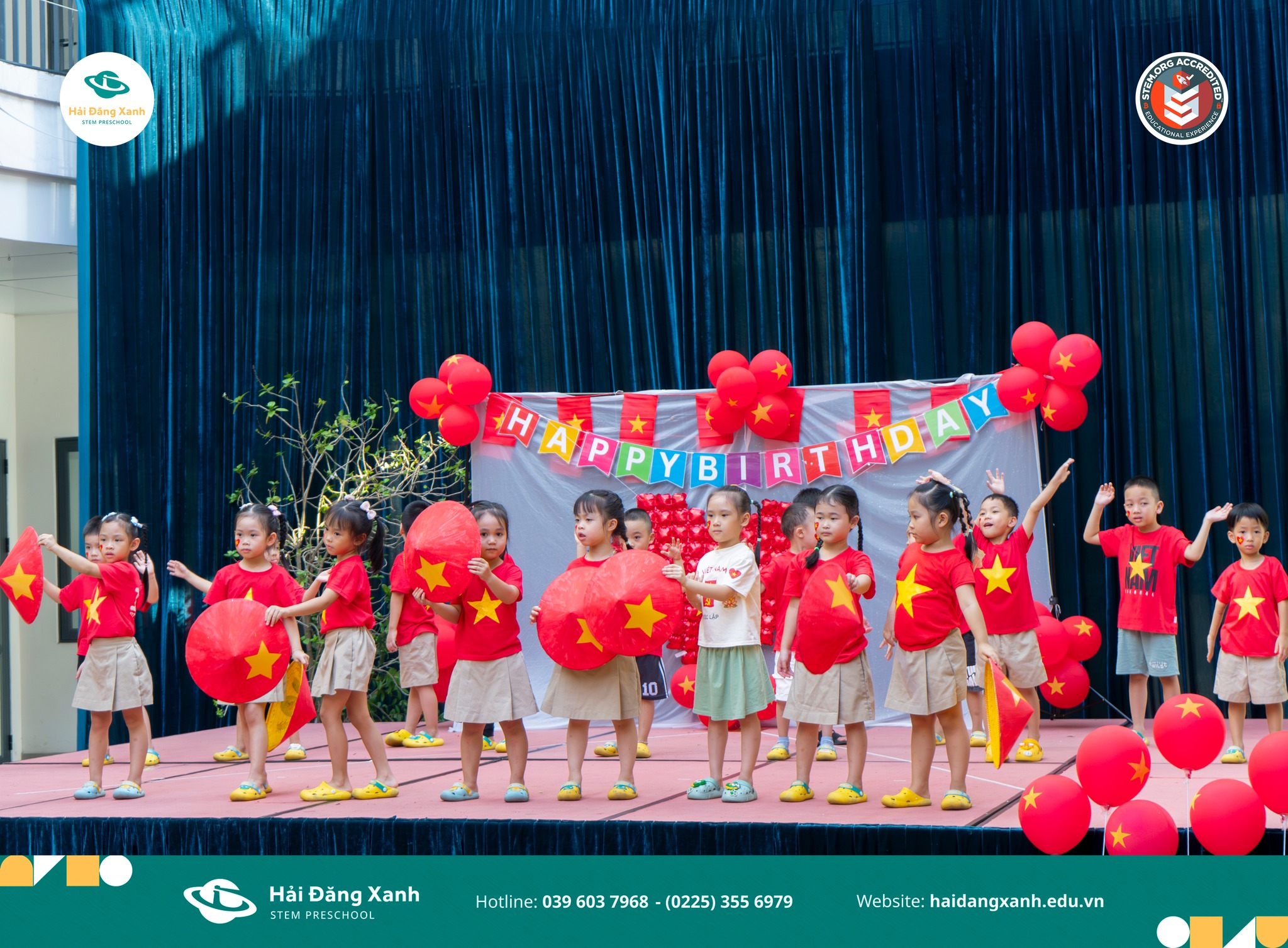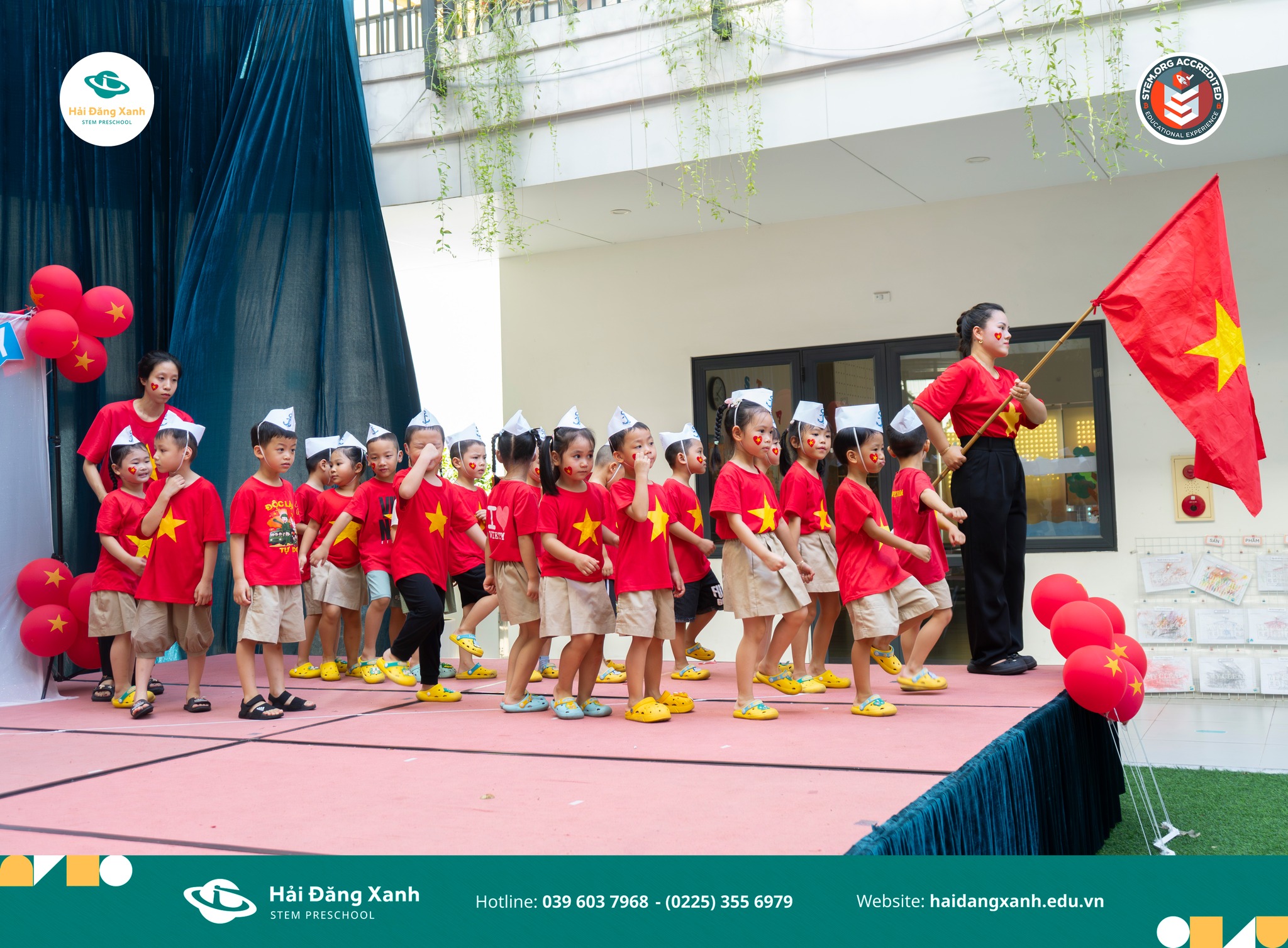 Trường Mầm non Hải Đăng Xanh tại Hải Phòng vừa tổ chức một sự kiện vô cùng đặc biệt nhân dịp Kỷ niệm 80 năm ngày Quốc khánh 2/9, kết hợp với tiệc sinh nhật cho các bé sinh vào tháng 8. Chương trình không chỉ là ngày hội vui tươi mà còn là bài học đầu đời về lòng yêu nước, biết ơn và tự hào dân tộc dành cho các “thủy thủ nhí”.